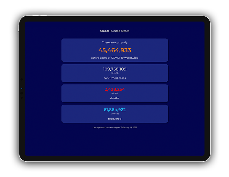 In React.js, I made an API call to the COVID-19 API. That data is stored in the application’s state, which also contains a “loaded” boolean that is false by default. Once the data is fetched, it changes to true and the dashboard appears. This is to prevent the application from displaying zero values before the data is retrieved.