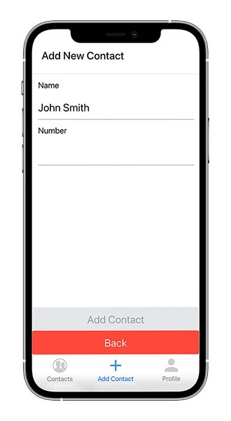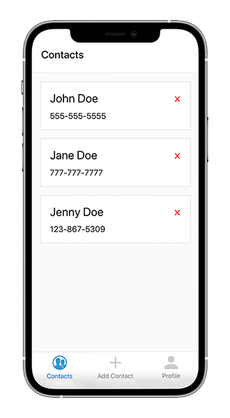 The red x’s on each card will remove the selected contact from the view and the server. The Add Contact screen is used to post new contact data to the server.