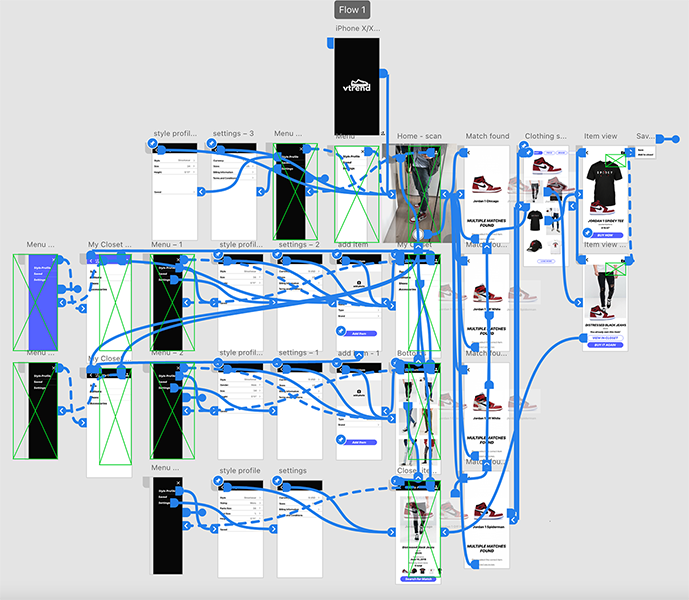 First, I started with a mind map laying out the basic idea of the product and its features. We then formed a team to conduct market research and create a market matrix. Of the 15 products researched at the time, only two had a feature that allows the user to scan an article of clothing and find matching or similar items.